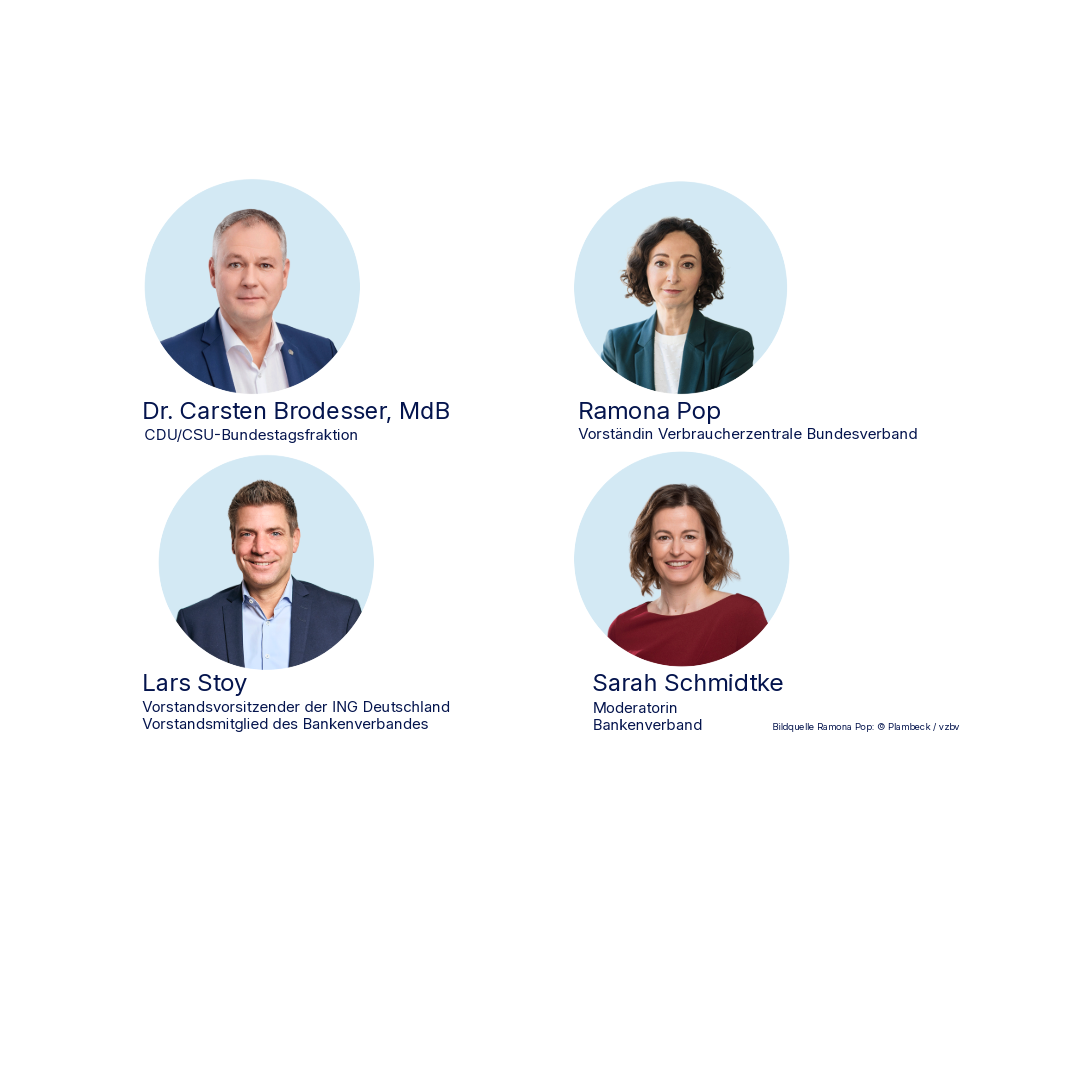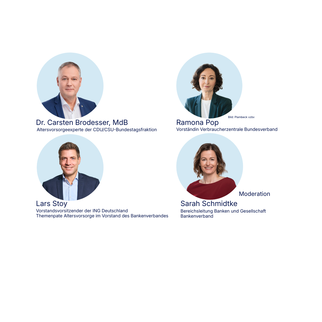 Es diskutieren Ramona Pop, Vorständin des Verbraucherzentrale Bundesverband, Carsten Brodesser, MdB, Altersvorsorgeexperte der CDU/CSU-Bundestagsfraktion und Lars Stoy, Vorstandsvorsitzender der ING Deutschland und Themenpate Altersvorsorge im Vorstand des Bankenverbandes, moderiert von Sarah Schmidtke, Bankenverband.