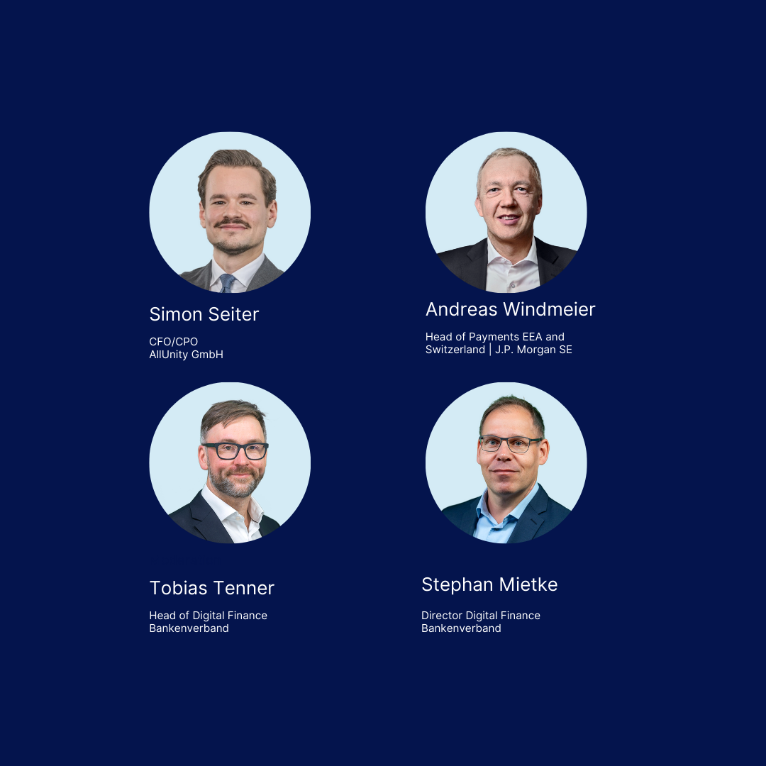 Nach der Präsentation von Stephan Mietke führte Tobias Tenner als Moderator unsere Gäste Simon Seiter, Managing Director und CFO/CPO, AllUnity GmbH und Andreas Windmeier, Head of Payments EEA and Switzerland, J.P. Morgan SE durch die Veranstaltung.